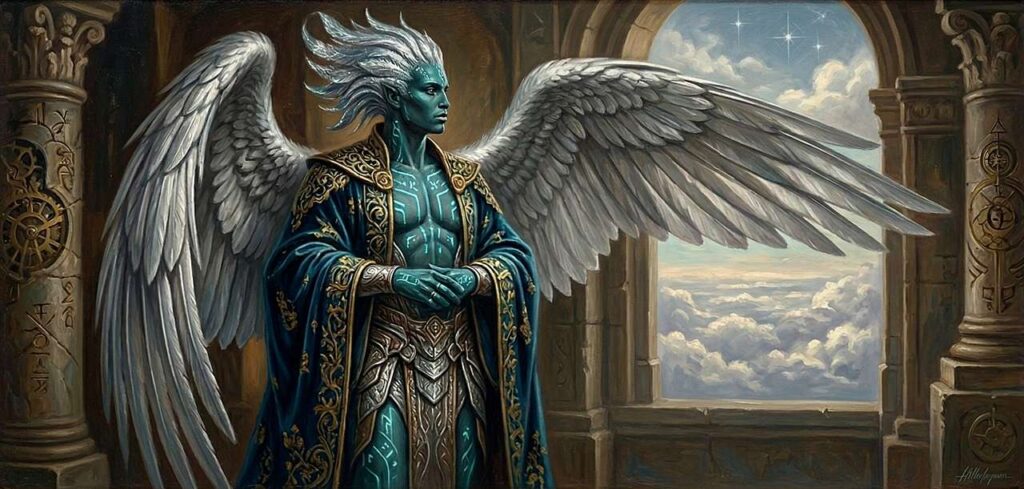 In appearance, Celestials are humanoid beings, about a head taller than the average human, with somewhat gaunt bodies, long limbs, and narrow skulls. They always possess four upper appendages—either four arms or a pair of arms and a pair of wings. Their skin is dark turquoise, while their hair, teeth, nails, and irises are a shimmering silver. If they possess wings, these are covered in silver feathers. Their hair is not like human hair but consists of very thin, long, soft, and free-falling silver plumes. They are so pliable that they can be easily tied or braided into a plait.